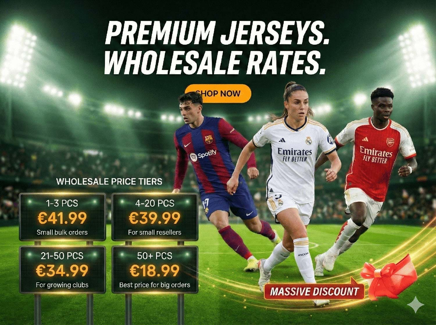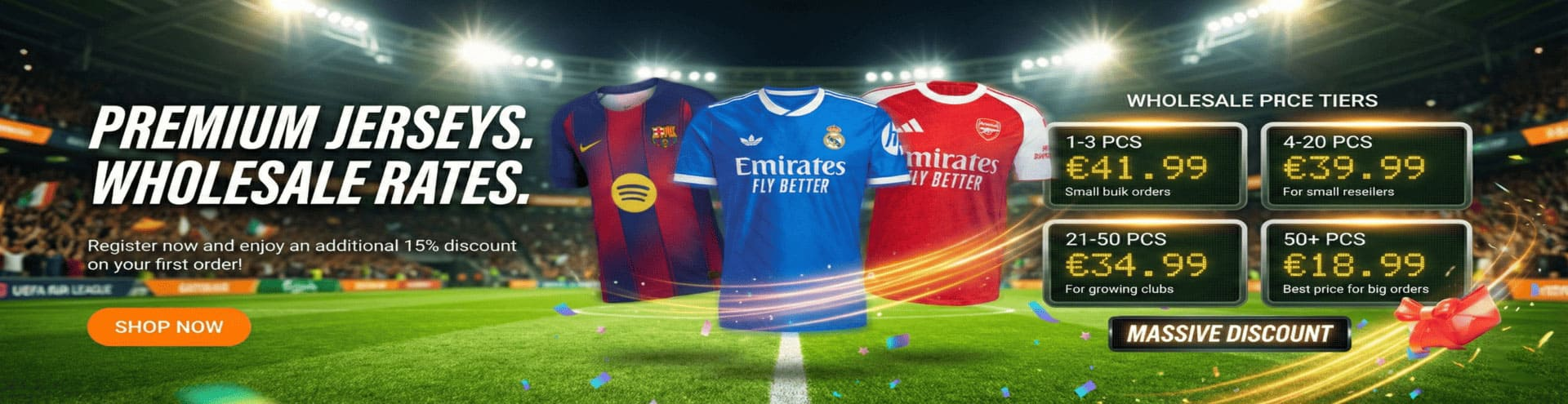 GoJersey understand that club loyalty is a powerful force in the soccer world. With an extensive selection of club soccer jerseys, you can showcase your allegiance with pride. From English Premier League giants to the fiery rivalries of La Liga, the store covers a diverse range of clubs, allowing you to don the colors of your cherished team. All jerseys are offered at wholesale prices. Connect with fellow football fans who share your passion and purchase soccer jerseys at wholesale together.